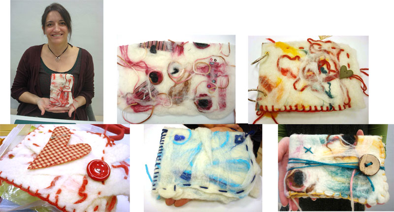 A todas nos encantó, y Alícia lo había previsto todo. Vino con un montón de cosas recicladas: postales, trozos de tela, lanas de color, etc. y muchas ideas para acabar llenando el mini-álbum que creamos.